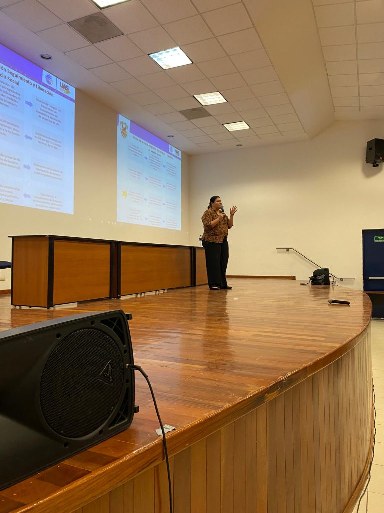 Durante su intervención, la ponente explicó el procedimiento para validar proyectos y plazas, y solicitó a los estudiantes mantenerse atentos a las actualizaciones y a la comunicación con los Departamentos de Servicio Social dentro de la facultad.