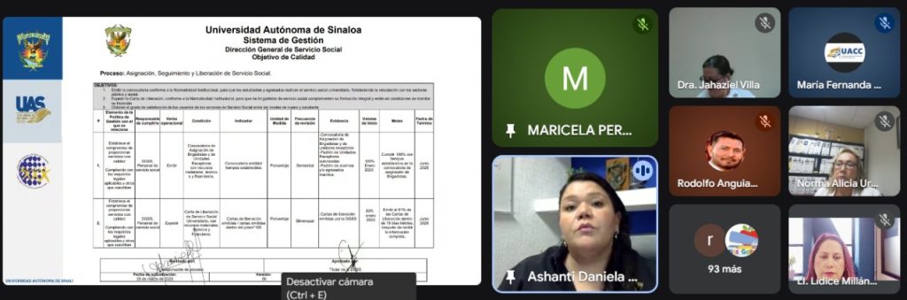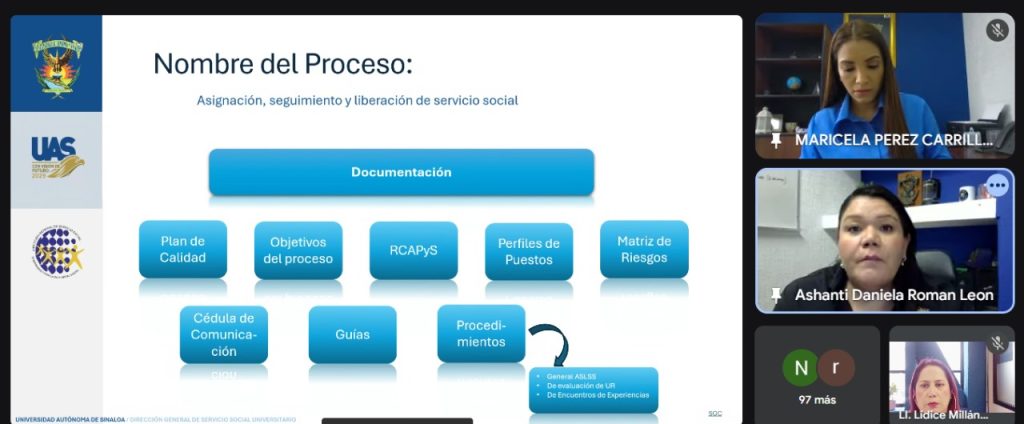 Como parte de los procesos institucionales de la Universidad Autónoma de Sinaloa (UAS), la Dirección General de Servicio Social Universitario (DGSSU) que encabeza la maestra en ciencias Maricela Guadalupe Pérez Carrillo, puso en marcha una jornada de capacitación del proceso certificado “Asignación, Seguimiento y Liberación de Servicio Social” este miércoles 10 de septiembre, impartida por la subdirectora de servicio social de la Unidad Regional Centro y responsable del proceso certificado, la licenciada Ashanti Daniela Román León.
